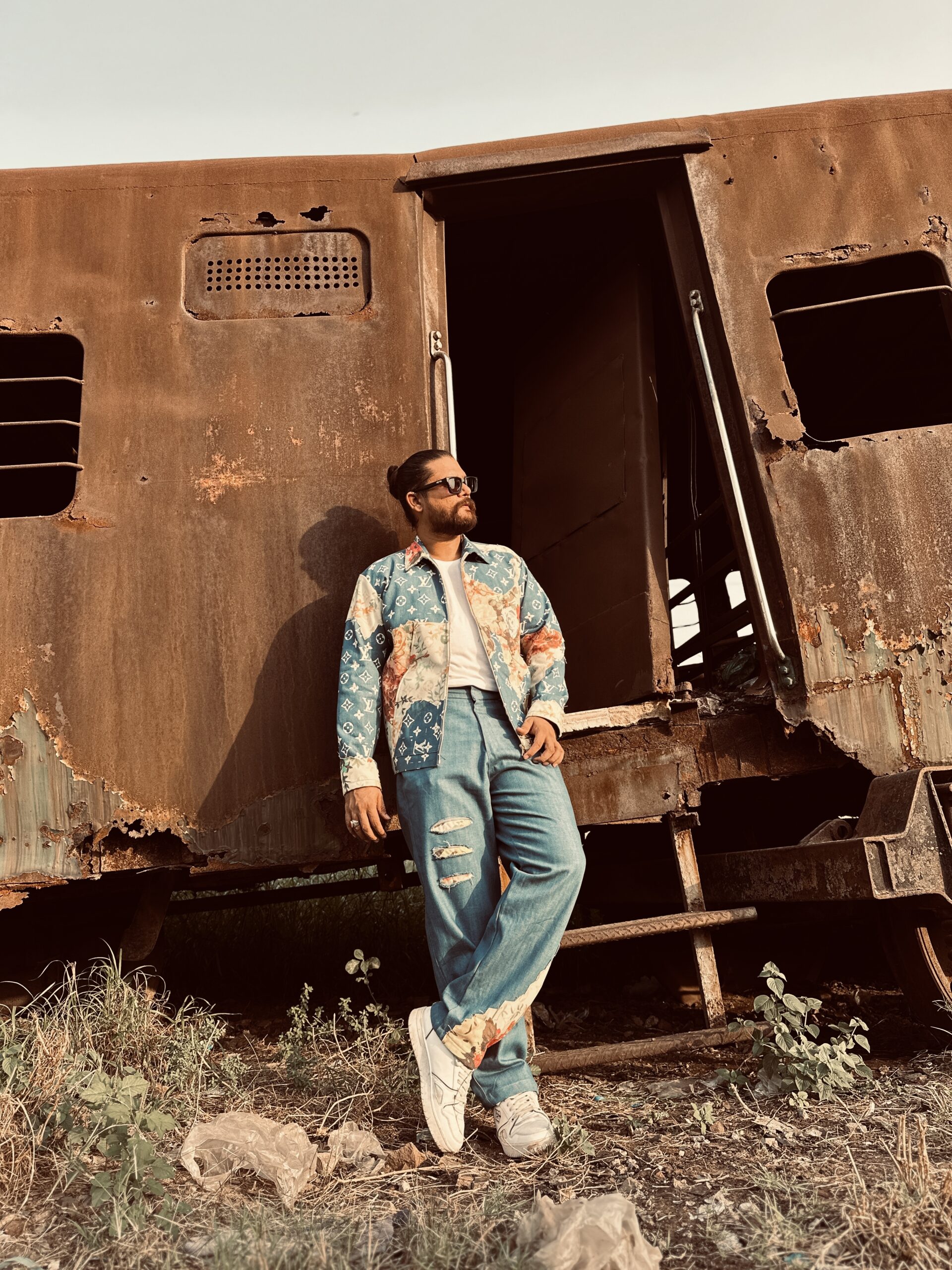 L V “Floral Monogram Patchwork Denim Jacket & Pants Set”